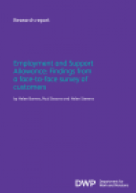 Barnes H, Sissons P, Stevens H | Oct 2010 | Department for Work and Pensions (DWP)This report presents the first findings of a representative face-to-face survey of 3,650 Employment and Support Allowance claimants. It was carried out between December 2009 and February 2010 by Ipsos MORI. The sample consisted of those who made a claim for ESA between April and June 2009, allowing a sufficient gap for the majority to have had a decision on the outcome of their claim by the time of the survey.