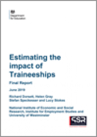 Dorsett R, Gray H, Speckesser S, Stokes L | Jun 2019 | Department for EducationBased on the analysis of national administrative data, this report estimates the effect of participating in a Traineeship on the three intended outcomes of progress into an apprenticeship, further learning or employment.