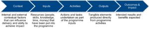 A logic model is a structured framework that explains how and why a programme or intervention is expected to achieve its intended impact. It describes the process of change by outlining causal linkages in programme design, delivery and outcomes. The visual framework is often accompanied by a narrative that explains the context of the logic chain and describes the flow from activities to impacts.