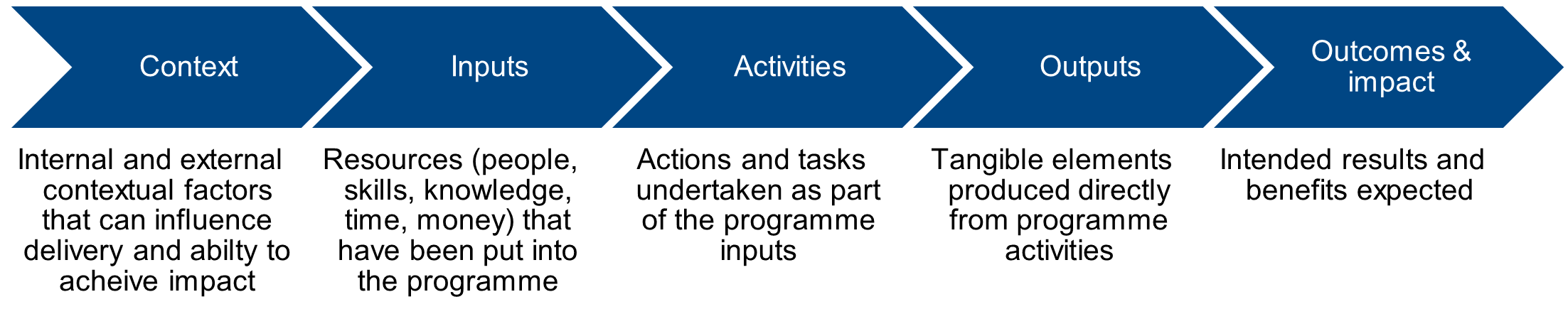 A logic model is a structured framework that explains how and why a programme or intervention is expected to achieve its intended impact. It describes the process of change by outlining causal linkages in programme design, delivery and outcomes. The visual framework is often accompanied by a narrative that explains the context of the logic chain and describes the flow from activities to impacts.
