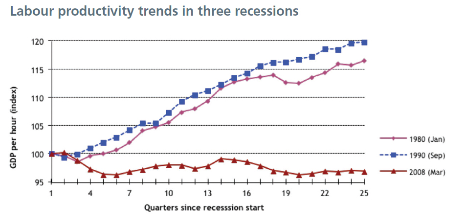 Does it matter? Well yes, especially since it’s gone on for so long, and productivity is still stagnating despite the resumption of economic growth. Economists, policy-makers and the Bank of England[1] have started to worry about a semi-permanent loss of competitiveness, and there has been a rash of suggestions about the cause of the “productivity puzzle”. Currently, the best guess is that it reflects several factors coming together at the same time.