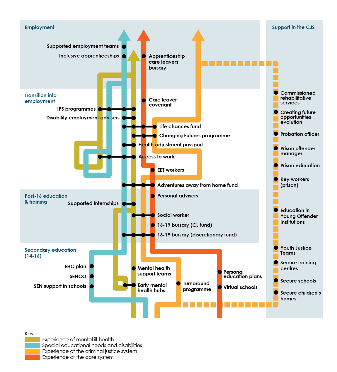Each group is represented by a ‘line’ that travels through the four life stages, or ‘zones’, passing through ‘stops’ that represent optional support available to them. In a few cases, like with IPS programmes, the line goes backwards – this is to say that this particular support is available in both life stages.