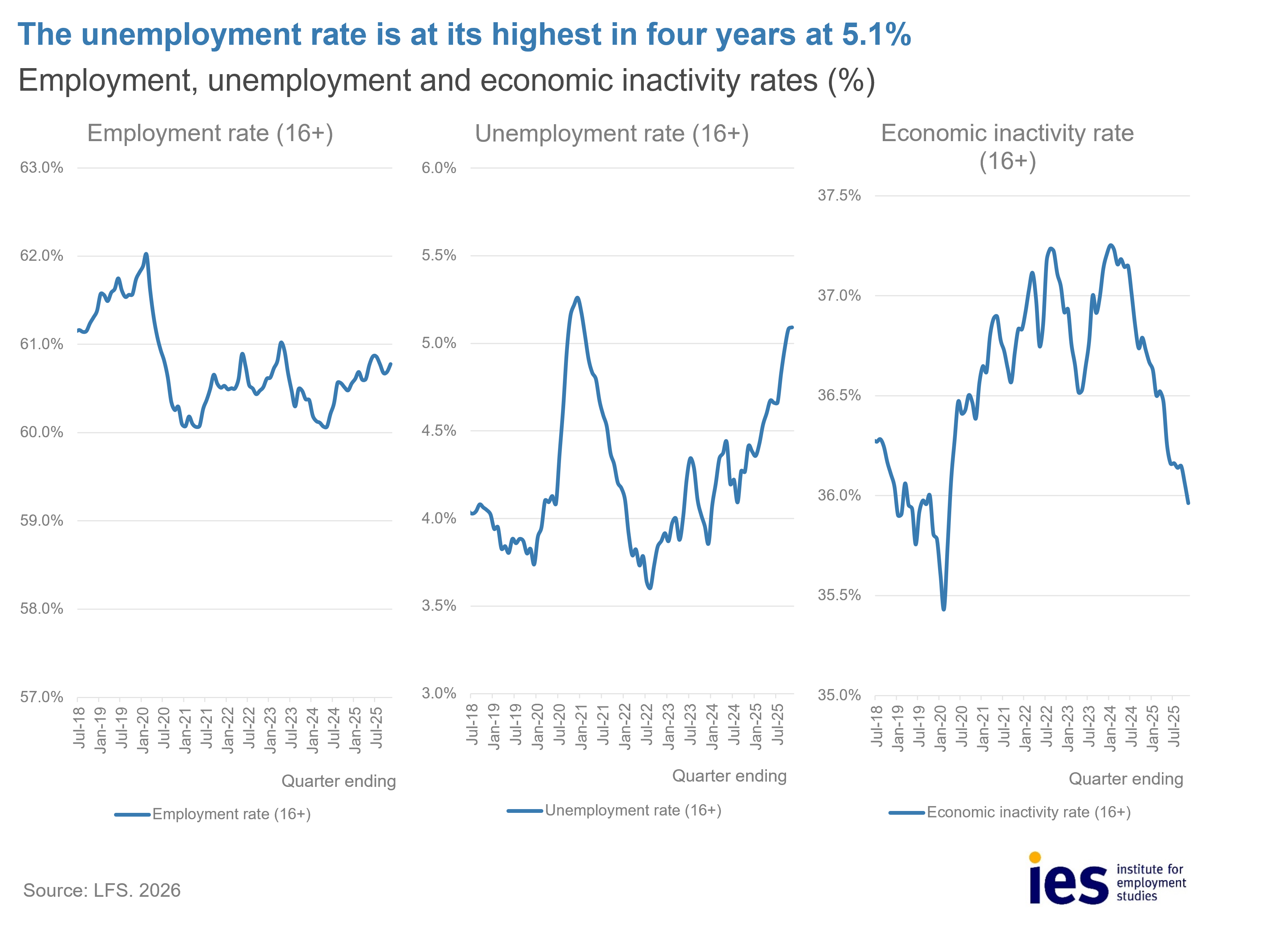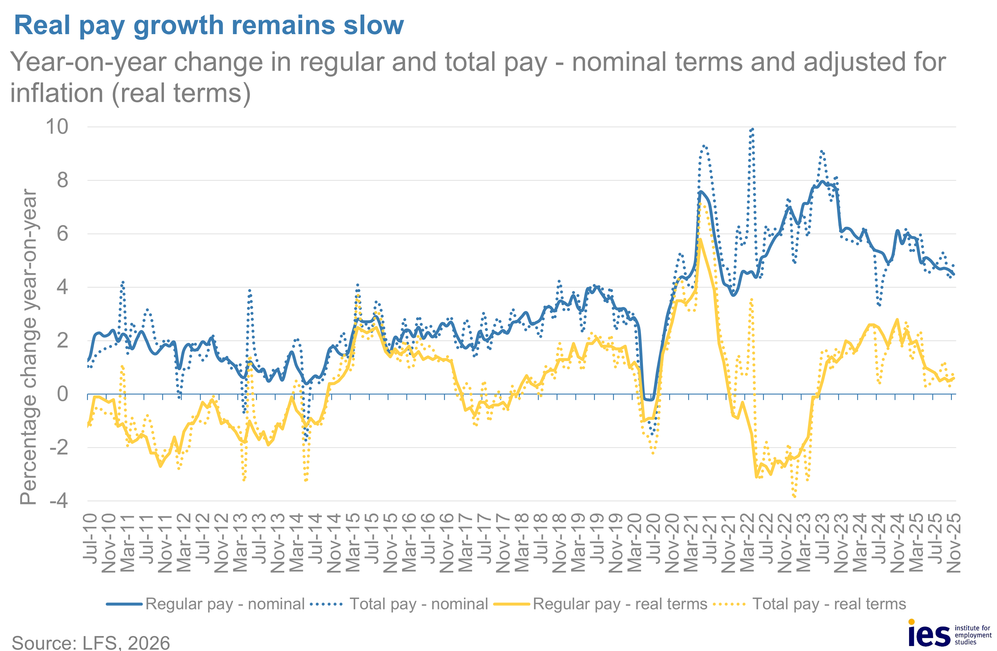 Real pay growth remains weak, particularly in the private sector. Inflation continues to erode the impact of nominal wage increases, with real annual regular pay growth at 0.6% in November 2025 – meaning that workers are only marginally better off than they were a year ago.
