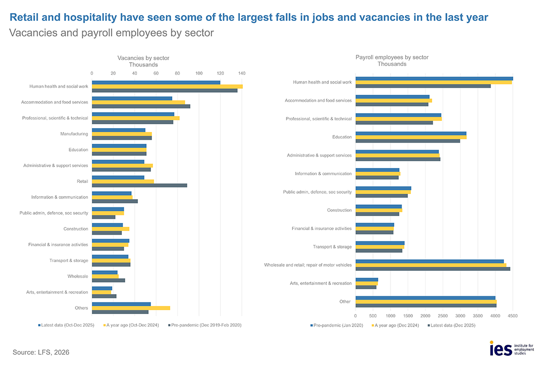Payrolled employment has fallen by over 90,000 in the last quarter – the largest fall outside the pandemic. This includes early estimates (subject to revision) which indicate that payroll employment fell by 42,500 in December. Retail and hospitality have seen the largest falls, with payrolled employment falling by 37,000 and 20,000 over the last quarter, respectively.