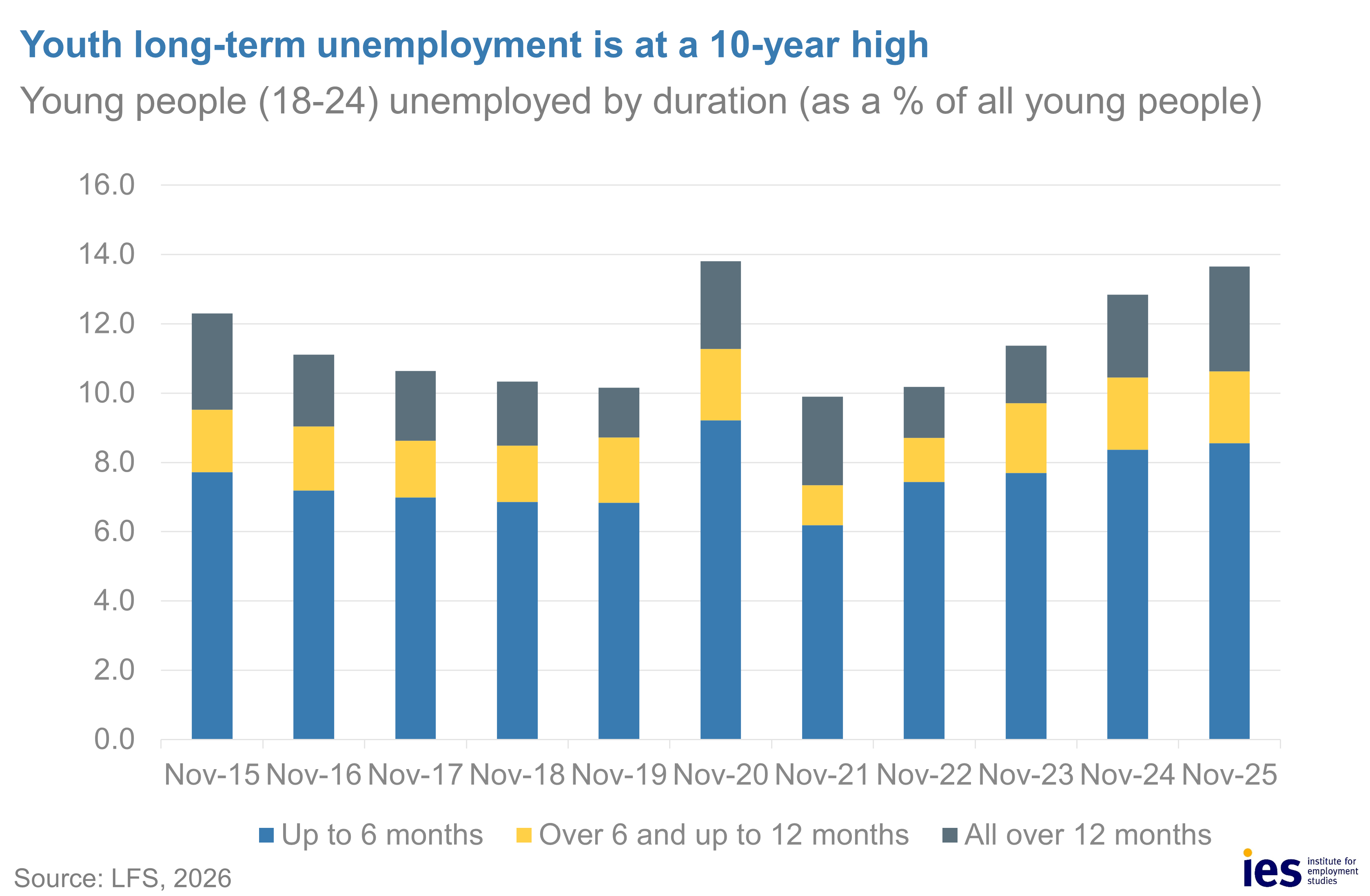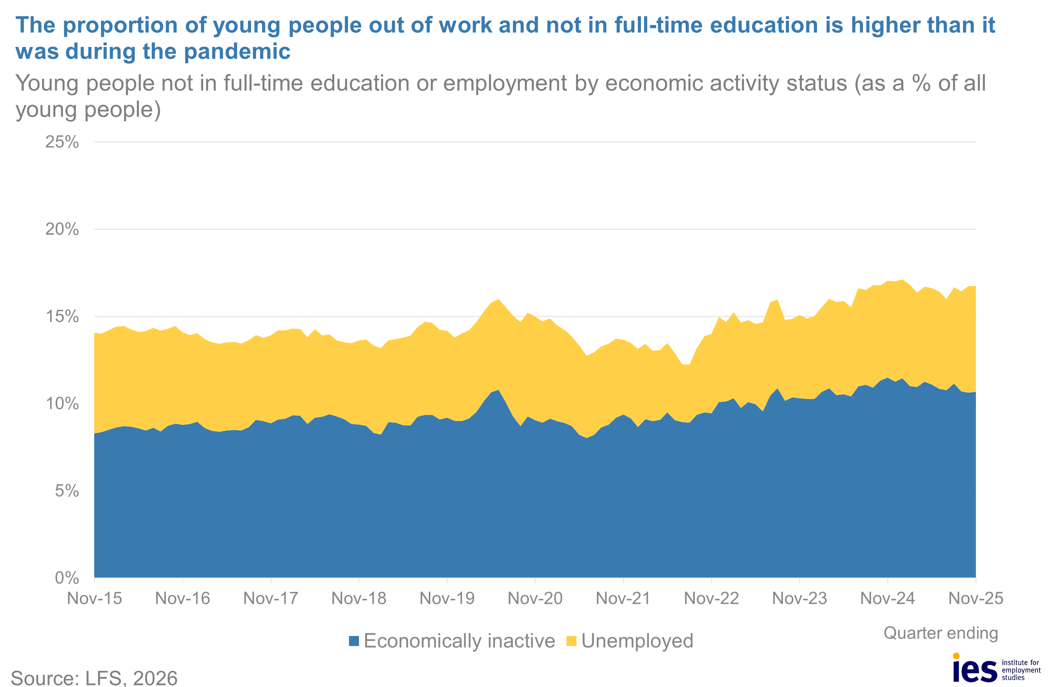 Increases in unemployment have been largely driven by young people who have been affected by the slowdown in hiring. The youth unemployment rate is the highest it has been in 10 years, including the pandemic, at 15.9%. Nearly 17% of all 16–24-year-olds are either unemployed or economically inactive and not in full-time education, which is higher than rates during the pandemic. An estimated 38% of young people, who are economically inactive and not students, are out of work and not actively looking for work due to long-term sickness – a sharp rise from 24% a decade ago and driven by increases in mental health conditions among young people.