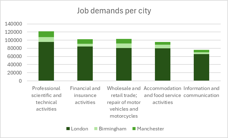 The Adzuna intelligence portal data illustrates the total job demand in London, Birmingham and Manchester during the last Financial Year of 2023-2024. Notably, it highlights the job demand imbalance across the cities, with London exceeding Birmingham and Manchester by nearly tenfold across the top five key industries such as professional scientific and technical activities, financial and insurance activities, wholesale and retail trade, accommodation and food services, and finally, information and communication. The city’s demand for roles in professional, scientific, and technical fields is particularly striking. Financial and insurance activities, another hallmark of London’s economy, similarly far outstrip demand in Birmingham and Manchester.