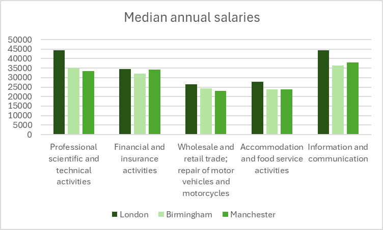 Moreover, using the Adzuna intelligence portal we calculate the gross salaries in the three biggest cities of the UK: London, Birmingham and Manchester. Not surprisingly, the offered median salaries being higher in the capital for these most demanded industries.
