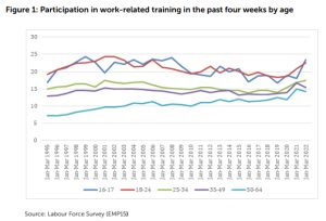 Another study by CIPD tracks a significant decline in participation in work-related training drawing on the Labour Force Survey. It shows that the rate of training in the first quarter of 2018 was about the same as it was in the same period in 1996 at around 14 per cent of all employees aged 16 to 64. The latest LFS data shows this figure increased to 17 per cent in the same quarter of 2021 and was stable at 17 per cent in 2022 (see Figure 1). However, before congratulating employers on changing tack, it is worth considering that in this timeseries, since 1995, this rate has not been exceeded in any quarter-year.