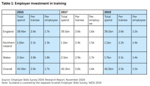 Data from the Employer Skills Survey shows that overall investment in training by employers in England, Northern Ireland and Wales was flat in real terms between 2015 and 2019 (see Table 1). That was pre-pandemic so it is likely that worse news is to follow in the next survey.