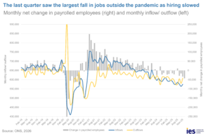 Payrolled employment has fallen by over 90,000 in the last quarter – the largest fall outside the pandemic. This includes early estimates (subject to revision) which indicate that payroll employment fell by 42,500 in December. Retail and hospitality have seen the largest falls, with payrolled employment falling by 37,000 and 20,000 over the last quarter, respectively.