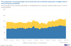 Increases in unemployment have been largely driven by young people who have been affected by the slowdown in hiring. The youth unemployment rate is the highest it has been in 10 years, including the pandemic, at 15.9%. Nearly 17% of all 16–24-year-olds are either unemployed or economically inactive and not in full-time education, which is higher than rates during the pandemic. An estimated 38% of young people, who are economically inactive and not students, are out of work and not actively looking for work due to long-term sickness – a sharp rise from 24% a decade ago and driven by increases in mental health conditions among young people.