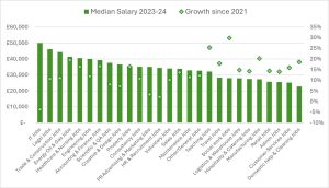 Using the Adzuna Intelligence Portal we can examine the salary trajectories in recent years. Different sectors showed markedly different salary trajectories in job vacancies, with the IT jobs leading in wage growth, with a median advertised annual salary of £50,130 across the period of Nov 2023-Oct 2024. The second place in wage growth is seen in Legal jobs with a median advertised annual salary of £46,180. Nevertheless, it is of note that from Nov 2021 to Oct 2024 the median advertised annual salary of Legal jobs has increased from £41,711 to £46,180 (i.e., 10.7%), while at the same time the median advertised annual salary in IT jobs has decreased from £52,072 to £50,130 (i.e., -3.7%). In terms of growth, the winning job sector according to the Adzuna job postings data is Social work Jobs, with a 29% median advertised annual salary increase over the period Nov 2021-Oct 2024. Teaching Jobs are in the second spot in terms of growth over the same period, with 25.4% rise, Manufacturing Jobs third with 20.2% rise, Energy Oil & Gas Jobs fourth with 19.5% rise, and on the fifth spot we find Domestic help & Cleaning Jobs with 18.6% growth. These sectors account for some of the lowest paying jobs in the UK, suggesting that there is a sort of catching up going on.