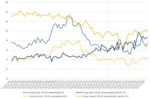 The longer-term picture is one where the proportion of young people who are NEET remains higher than pre-pandemic levels and there has been a significant increase in the proportion of young men who are NEET and economically inactive. The proportion of 18–24-year-old women who are NEET and economically inactive is at a similar level to where it was 10 years ago (having fallen and then increased) and the number of 18–24-year-old men who are economically inactive has risen by over two thirds. This means that there are now more young men who are NEET not participating in the labour market than there are seeking work (unemployed).