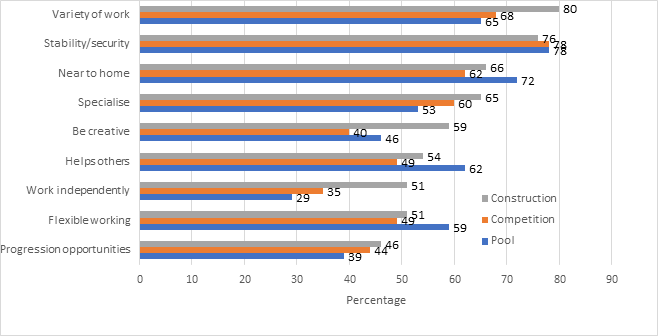 Flexibility in work hours was more important to respondents in industries that more typically offer it. Hospitality and retail typically offer a choice of shift lengths and part time arrangements, whilst in construction, contractual flexible hours arrangements are less common with only around 12% of the workforce having this kind of flexibility. Survey respondents working in hospitality, retail, health and social care were more likely than average to value flexibility. In construction, considerations such as having pride in work, and stability, but also variety and change were most important in explaining work decisions (see chart).