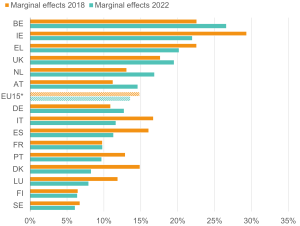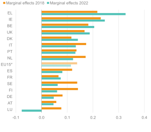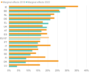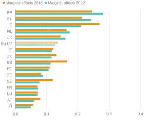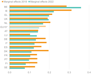 Likelihood (margins) of being out of work for 16–64-year-olds with health limitations; EU15 countries, 2018 and 2022