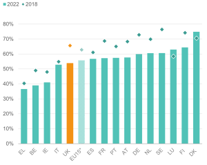 - Between 2018 and 2022 there was a reduction in the employment rate of people with health limitations in most European countries. The UK ‘employment gap’ between those with and without health limitations is shown by available data to be among the highest in the EU15.