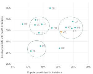 Figure 3: The UK’s performance places it among the countries with more health limitations and slightly below average employment outcomes