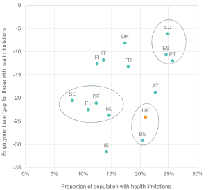 The UK’s position in the lower right of the figure reflects a comparatively high share of people reporting health limitations alongside a substantial health employment gap. Countries in the top right, such as Luxemburg, Spain, and Portugal, also have high shares of people with health limitations but with narrower employment gaps. Meanwhile, countries like Germany, Greece and Sweden appear to have some of the lowest shares of people reporting health limitations but display employment gaps similar to those seen in countries with higher shares of people with health limitations.
